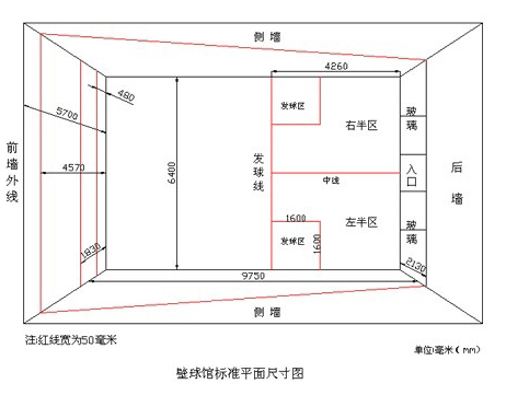 一、 場(chǎng)地標(biāo)準(zhǔn)(國(guó)際標(biāo)準(zhǔn)競(jìng)賽場(chǎng)地) 寬6.4米,長(zhǎng)9.75米,前高4.57米,后高2.13米,天花高度5~6米,響板高度0.48米,正面發(fā)球線高度1.83米,地面發(fā)球線距后墻4.26米,半場(chǎng)線將地面發(fā)球線與后墻從中心向左右平分,發(fā)球區(qū)為1.6米見方。
